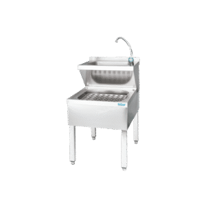 Górny blat o wysokości 40 mm wykonany ze stali nierdzewnej AISI 304 z rantem tylnym 40 mm, z tłoczoną umywalką o wymiarach 285 x 440 x 130 mm wyposażoną w kran, odpływy, syfon i węże przyłączeniowe. Blat dolny o wysokości 40 mm wykonany ze stali nierdzewnej AISI 304 z tłoczoną komorą o wymiarach 400 x 400 x 200 mm. Wysokość nóżek 360 mm, z możliwością regulacji +/- 20 mm. Zlew porządkowy z umywalką dostarczamy z jednouchwytową baterią 1/2” i wspólnym odpływem dla obu komór. Możliwy montaż ścienny.