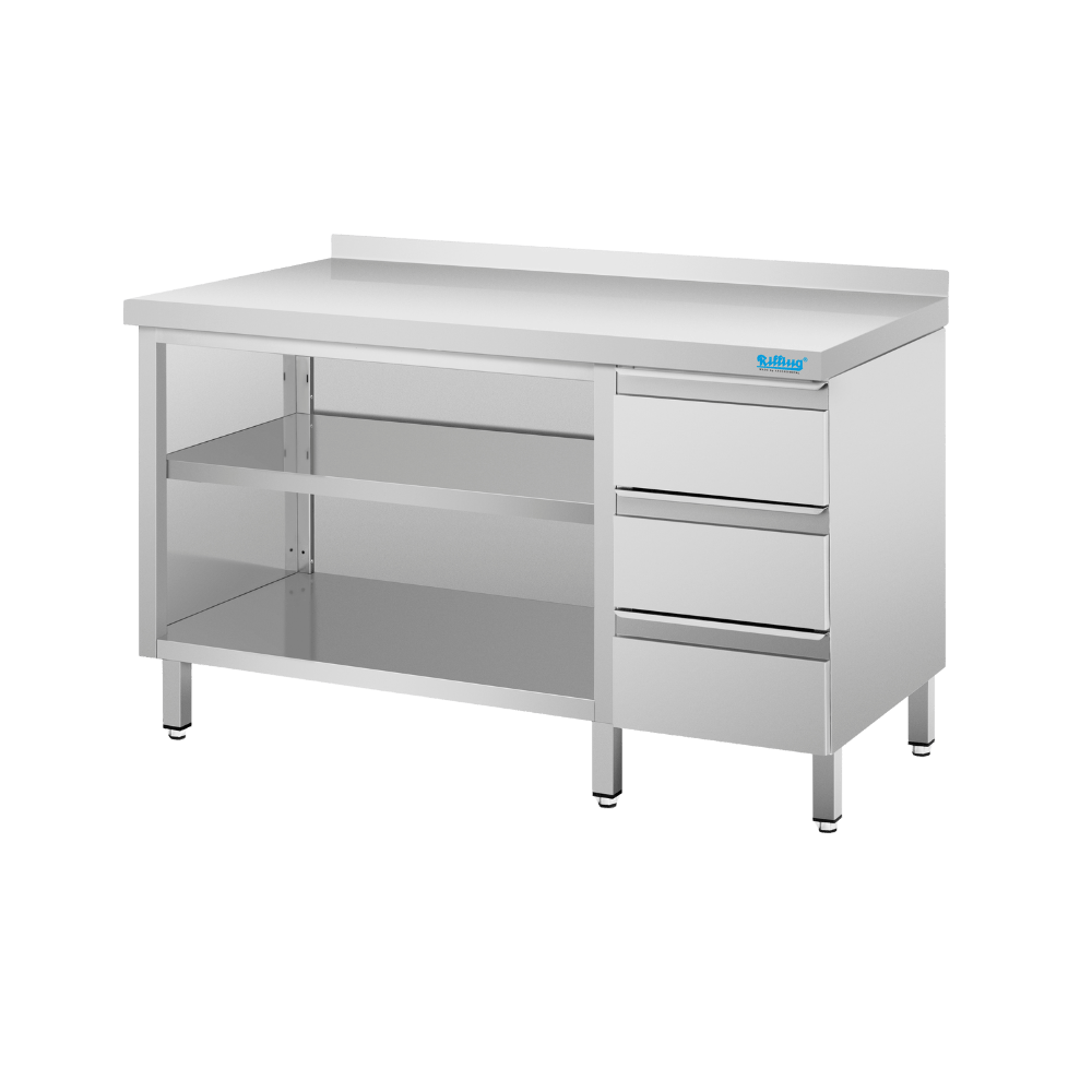 Szafka zamknięta z 3 stron z dolną półką i półką przestawną. Po lewej stronie blok 3 szuflad skrzyniowych.