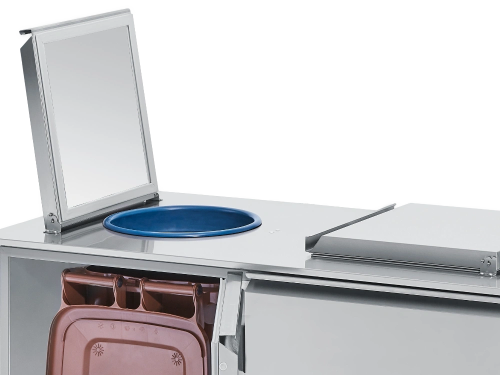 Poza wysokiej jakości izolacją korpusu chłodniczego, urządzenie zostało wyposażone z górną klapę do zrzutu odpadów, która ułatwia obsługę schładzarki, oraz zdecydowanie ogranicza straty energii podczas otwierania i zamykania urządzenia. Przekłada się na niższe koszty eksploatacji oraz konserwacji.